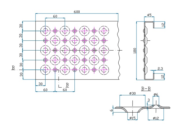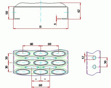 Este realizat prin ambutisare la rece din tablă zincată cu grosimea de 3 mm. Se pot realiza platforme, pasarele, scări, schele pentru construcții civile, industriale sau socio-culturale. Lungimea grătarului, “L” se specifica in comandă și va fi multiplu de 30 mm +50 până la maxim 3000 mm; Dimensiuni maxime: 300 x3000 mm.