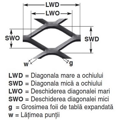 Tablă expandată din oțel zincat, cu: Diagonala mare a ochiului (LWD)=28 mm;
