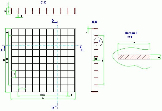 Se realizeaza din tabla de otel de 2 mm, zincata termic, cu grosimea stratului de zinc de 80 μm. Suporta o sarcina maxima de 600 Kg/m2. Deschidere ochi 33x33 mm; Platbanda principala 2x30 / 3x30 mm; Platbanda secundara 2x15 / 3x18 mm; Dimensiuni maxime: 1000 x 2000 mm cu rama; Gratarele se pot debita la dimensiunile din proiect;
